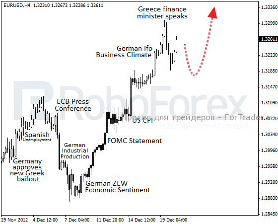 Тригером для начала коррекции стали комментарии главы греческого минфина, который не исключил, что в дальнейшем может последовать выход страны из еврозоны. Причём несколькими часами до этого заявления ЕЦБ объявил, что снова будет принимать греческие долговые обязательства в качестве залога, что крайне позитивно было воспринято рынком — доходность по бумагам опустилась до 21-месячного минимума. Практически сразу после этого агентство S&P заявило о повышении рейтинга Греции, поскольку операция обратного выкупа бондов завершилась.