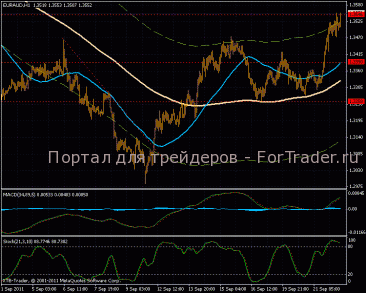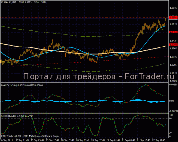 На часовом графике восходящая тенденция, линии МА параллельны и направлены вверх, цена актива у верхней границы 1,5 процентного канала. Индикатор MACD отбившись два раза от своей нулевой линии, начал расти в положительной зоне. Стохастический осциллятор перекуплен, часовой график говорит о повышенной готовности к откату.