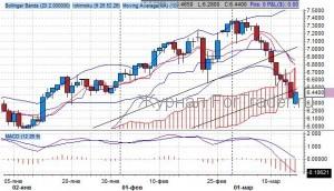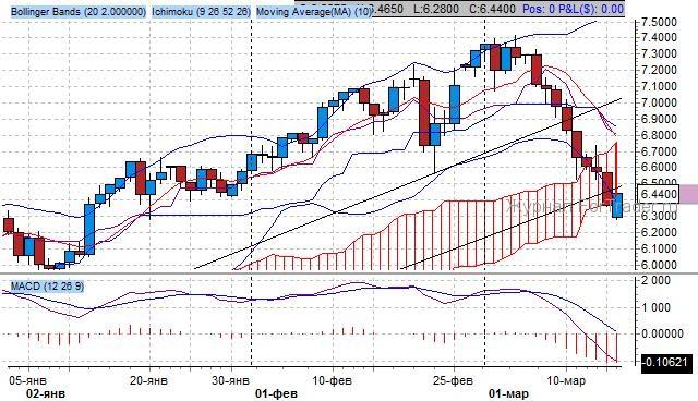 Согласно индикатору Bollinger Bands, котировки на фьючерс после выхода за верхнюю границу ценового канала на уровне 7.40 развернулись с прицелом снижения до нижней границы диапазона, сейчас это уровень 6.70. Скольжение котировок совпало с правилом применения индикатора Bollinger Bands: после достижение верхней границы канала и выхода из него, стоит дождаться продаж до нижней границы среднесрочного динамического канала. Согласно индикатору, уровень поддержки проходит через отметку 6.40 пункта.