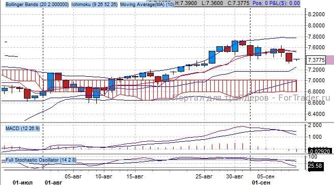 Согласно индикатору Bollinger Bands, котировки на фьючерс после завершения покупок должны скорректироваться до нижней границы канала (и верхней границы Облака Ишимоку) на 7.00 $/бушель. Прогноз: движение котировок сочетается с правилом применения индикатора Bollinger Bands: после достижения верхней границы канала, с выходом за последнюю, стоит дождаться выражения импульса до нижней границы на 6.80-7.00 $/бушель. Согласно данным индикатора Ишимоку, фьючерс торгуются во власти повышательного тренда. Ключевые скользящие средние смотрят разнонаправлено: быстрая – горизонтально, медленная – повышательно. Это признак коррекции тренда.
