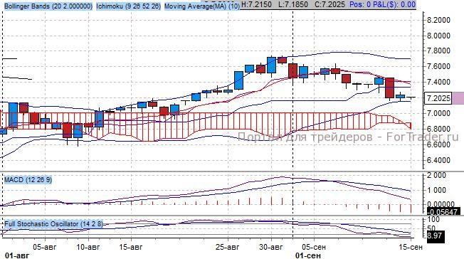 Согласно индикатору Bollinger Bands, котировки на фьючерс после завершения покупок скорректировались до нижней границы канала (и верхней границы Облака Ишимоку) на 7.20 $/бушель. Прогноз: движение котировок сочетается с правилом применения индикатора Bollinger Bands: после достижения верхней границы канала, с выходом за последнюю, стоит дождаться выражения импульса до нижней границы на 7.20 $/бушель. Согласно данным индикатора Ишимоку, фьючерс торгуются во власти повышательного тренда. Ключевые скользящие средние смотрят синхронно: быстрая – горизонтально, медленная – горизонтально. Это признак смены тренда.