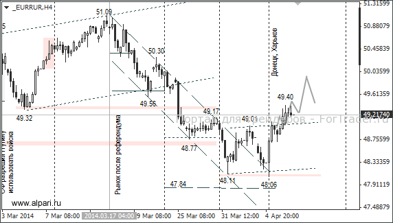 Курс евро в среду обновил локальный максимум на 49,40 руб. После коррекционного отката продолжительностью 5-6 часов рост может возобновиться с новой силой. Любая негативная новость из Украины или Европы в адрес России, окажет на рубль давление. В этом случае рубль подешевеет как к евро, так и доллару. Цель по евро находится на отметке 50 рублей ровно.