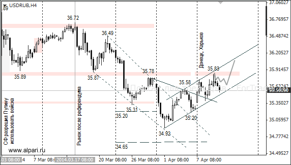 Курс доллара от минимума 34,92 (1 апреля) движется по восходящему каналу с диапазоном 47 копеек. В настоящий момент пара находится у нижней границы и при отскоке доллара на рынке форекс курс вполне может укрепиться до 36 рублей.