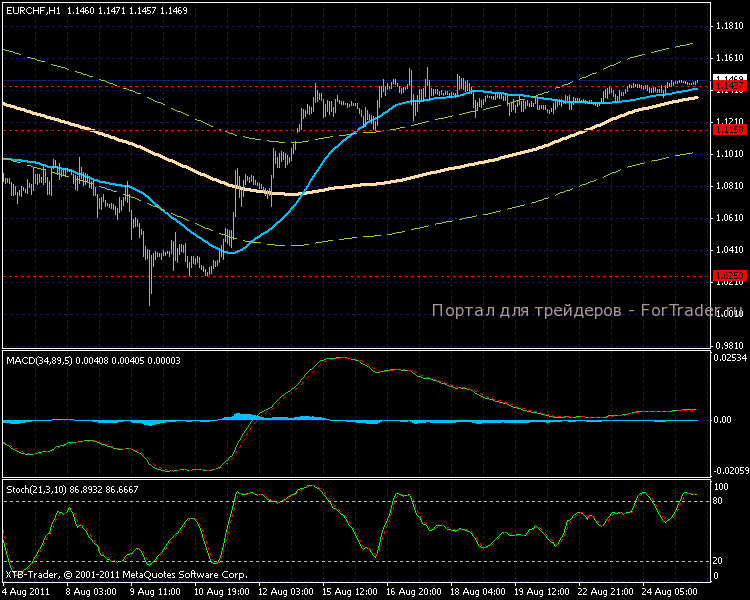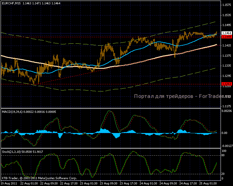 С 12 августа текущего года валютная пара EUR/CHF торгуется в узком диапазоне в уровнях 1,1158-1,1500. Уже второй день подряд цена финансового инструмента заворачивается наверх, в течение нескольких дней можем дойти до 1,1800.