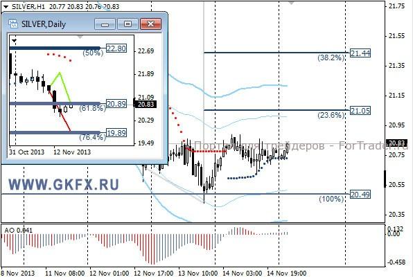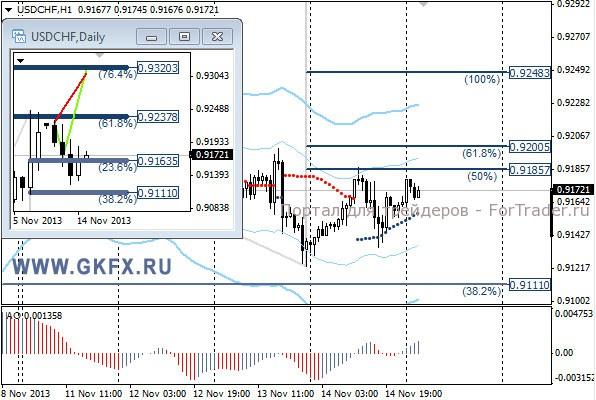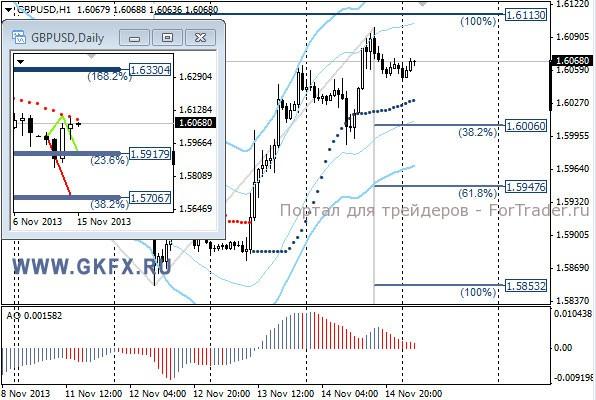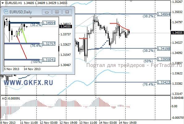 Пара EURUSD снижалась на европейских торгах в соответствии с ожиданиями, на слабых данных по ВВП Еврозоны. Однако на американских торгах все пошло не по намеченному сценарию. Второй день выступления заместителя председателя ФРС США Джанет Йеллен и возможного будущей главы ФРС принес известия, что она видит использование QE3 в текущее время целесообразным и оправданным. Из этого участники рынка делают выводы, что сокращения QE3 в декабре ждать не стоит. Курс EURUSD это подтверждает. По рекомендации сделка исполнилась, но даже первой цели не достигла. На эту неделю традиционно рассматриваю два варианта возможного движения цены, основной красный и альтернативный зеленый. Значимые уровни на сегодня отмечены на часовом графике. Индикатор АО находится в отрицательной зоне и снижается, указывая на желание пары двигаться вниз в данное время. Индикатор тренда указывает на снижение. Преодоление 1,3420 даст возможность для продаж с целями 1,3400, 1,3370 и 1,3340.