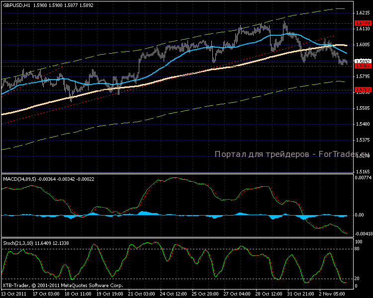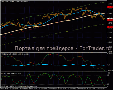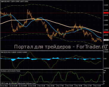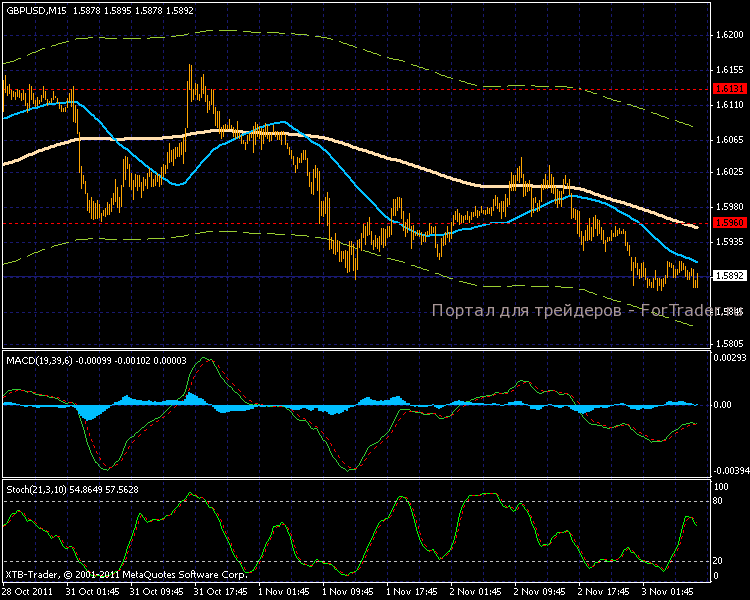 На 15-ти минутке плавное постепенное снижение цены в рамках привычного канала, линии МА направлены вниз. Колебания индикатора MACD постепенно затухают, что может повлиять на время пребывания графика в падении. Скорее всего, мы наблюдаем глубокий откат, который продлиться максимум к уровню 1,5700.