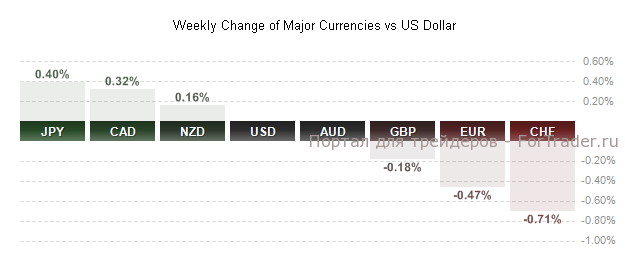По итогам прошедшей недели доллар США показал разнонаправленную динамику к основным валютам, прибавив 0,24% по индексу доллара и укрепляясь по DX уже вторую неделю подряд. Доллар вырос к европейским валютам, но ослаб к йене и сырьевым валютам, не изменившись к AUD. Наибольший рост доллар продемонстрировал к швейцарскому франку и евро, а больше всего снизился к йене и канадскому доллару.