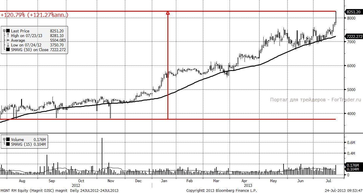 Магнит опубликовал хорошие финансовые результаты первого полугодия по МСФО. Акции крупнейшего ритейлера Магнит впечатляют своей динамикой. За год рост составил более 120%. Если судить по техническому анализу, то рост продолжится. Это подтверждается объемом торговли и скользящими средними.