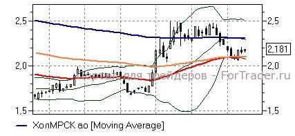 Холдинг МРСК (+1,67%) – акции, как и ожидалось нами на прошлой неделе, в ходе отскока от локальных минимумов подошли к средней полосе Боллинжера дневного графика (2,208 руб), у которой приостановили повышение. Технические индикаторы дают умеренно положительные сигналы, не исключая развития роста, однако, предупреждают и о том, что силы «быков» ещё невелики и с открытием новых «длинных» позиций стоит подождать до закрепления выше сопротивления 2,235 руб. В этом случае можно ожидать движения бумаг ближе к 2,30 руб (линия EMA200) и выше, в то время как при обратном сценарии возрастут риски возвращения к недавним минимумам.