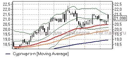 Сургутнефтегаз ап (+0,97%) – акции, несмотря на коррекцию с утренних максимумов, по-прежнему торгуются выше средней полосы Боллинжера (20,9 руб), до закрепления ниже которой стоит сохранять «длинные» позиции с расчетом на возвращение к локальным максимумам (21,5-22 руб). Технические индикаторы дневного графика дают умеренно положительные сигналы и не исключают «бычьего» сценария развития событий, предупреждая также о том, что сила восходящего движения ещё не очень велика и игрокам на повышение стоит проявлять осторожность.