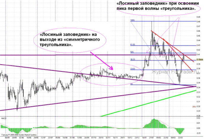 Со временем же на графике появились промежуточные сопротивления. Уровень 0,415 рубля — 50%-ной коррекции по Фибоначчи к падению котировок с января по март 2011 года и отметка 0,43 рубля — уровень 61,8% той же растяжки Фибо.
