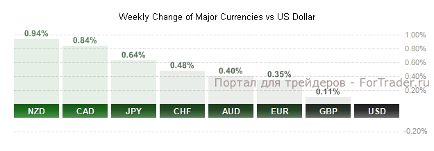 По итогам недели доллар снизился ко всем основным валютам, потеряв 0,42% по индексу доллара. Снижение по DX идет уже вторую неделю подряд. Доллар попал под давление на фоне слабых данных макростатистики, после того как ФРС на прошедшем заседании указала, что будет сохранять процентные ставки на низком уровне в течение длительного времени. Больше всего к доллару за неделю вырос новозеландский доллар и канадский доллар. По итогам почти завершившегося месяца, доллар также упал ко всем основным валютам. Наибольший рост показали NZD (+2,5%), CAD (+1,8%) и AUD (+1,8%).