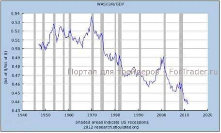 Зарплатный компонент ВВП находится в области исторического минимума на уровне 43,5% ВВП, по данным ФРБ Сент-Луиса, по сравнению с 48% до начала кризиса. Сейчас работающее население получает самое низкое вознаграждение в новейшей истории, что частично вызвано «эволюционными» причинами, такими как перевод операций компаний за рубеж и автоматизация процессов, но это в любом случае значительное изменение.
