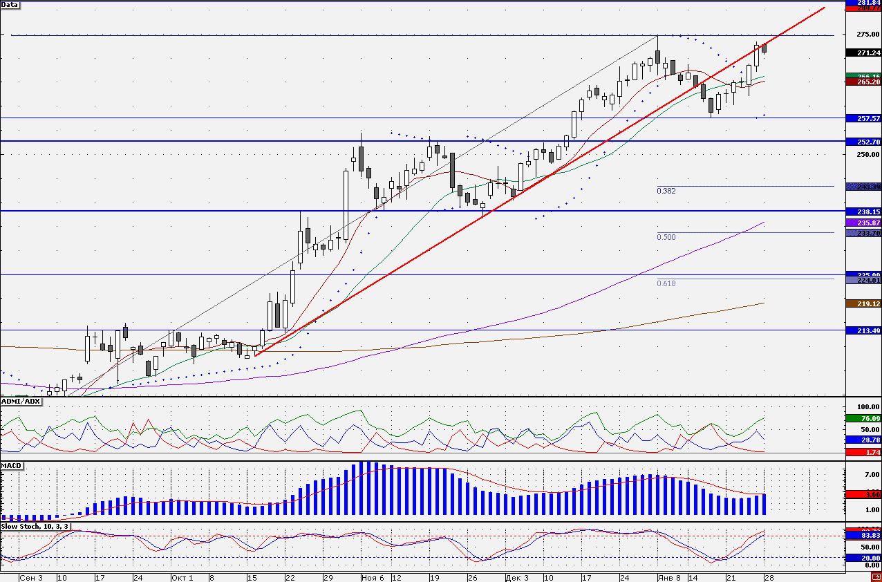 Акции «Роснефти» в первой половине дня снизу вверх протестировали линию восходящего тренда, действующего с октября прошлого года, поле чего был сформирован откат вниз. Вероятность того, что снижение будет продолжено, достаточно велика. Индикатор MACD(12;26;9) подает сигнал на продажу (сигнальная линия сверху вниз пересекается с гистограммой). Также осциллятор медленный Stochastic (10;3;3) находится в зоне перекупленности, что может свидетельствовать о продолжении нисходящей динамики акций. Таким образом, при сохранении негативных настроений ближайшей целью для снижения может выступить отметка 266,15 руб., где проходит 10-дневная скользящая средняя. Наш 30-минутный торговый робот находится в «лонгах», удерживая длинные позиции от отметки 261,87 руб., но готов перевернуться. Таким образом, возможные отскоки стоит использовать для закрытия длинных позиций, при этом инвесторы более склонные к риску могут открыть короткие позиции с ближайшей целью достижения 10-дневной скользящей средней.