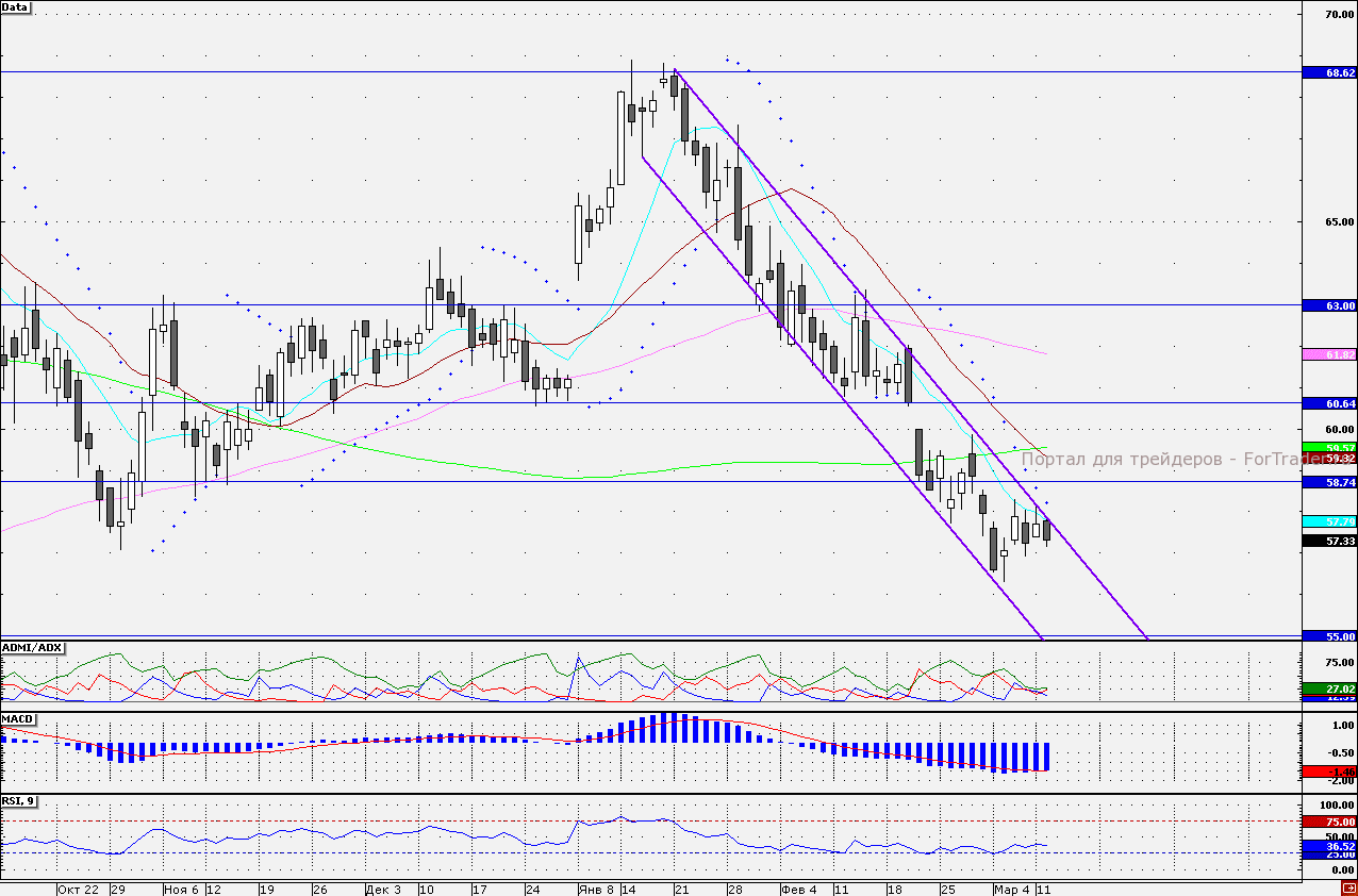 Акции НЛМК продолжают торговаться в рамках нисходящего канала, действующего с января текущего года. Сегодня бумаги откатываются вниз от верхней границы канала, усиленной близостью прохождения 10-дневной скользящей средней, проходящей в районе 57,80 руб. При продолжении отката целью выступает минимум текущего года, на отметке 56,30 руб. Показания трендовых индикаторов пока не дают сигналов на разворот. Индикатор ADMI/ADX показывает, что силы «медведей» по бумагам пока преобладают (линия «быков» находится» ниже линии «медведей»), при этом график индикатора MACD (12;26;9) все еще снижается на отрицательной территории. Таким образом, короткие позиции по бумагам пока более привлекательны, целью для них может выступить отметка 56,30 руб. Привлекательность длинных позиций возрастет лишь после закрепления над верхней границей нисходящего канала. Наш 30-минутный торговый робот открыл короткие позиции от отметки 57,86 руб. и пока удерживает их.