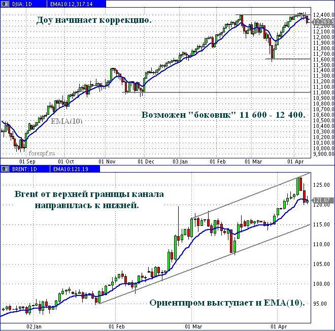 После затяжного стояния на месте американский фондовый рынок пытается обозначить новое направление движения. На последней торговой сессии, 12 апреля, индекс Доу-Джонса резко ушёл вниз, в ту же сторону начинает разворачиваться и скользящее среднее ЕМА(10), обозначающее линию текущего краткосрочного тренда. Вполне возможно, что это очень серьёзная заявка на коррекционное движение, которое, впрочем, в последние дни ожидали многие трейдеры.