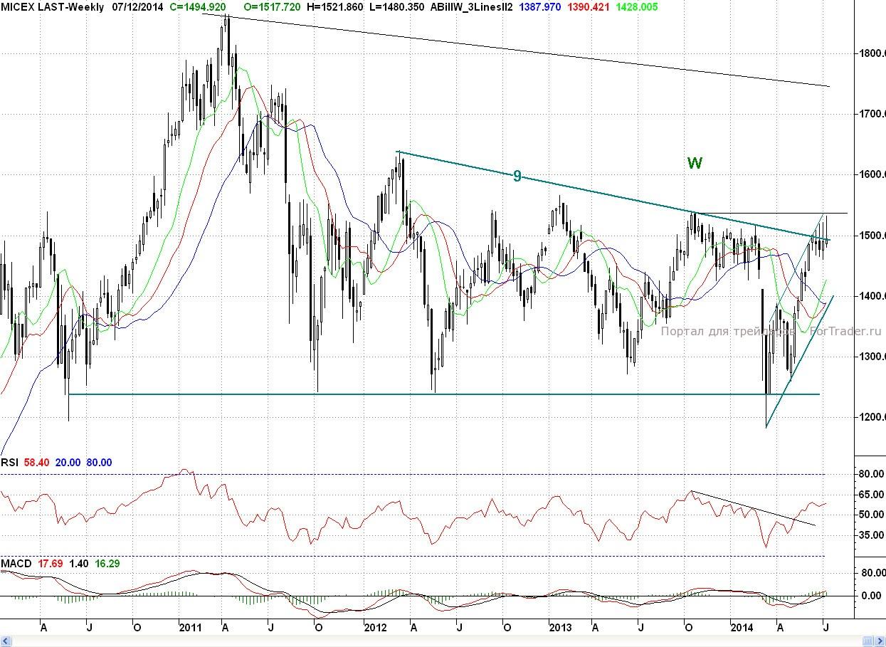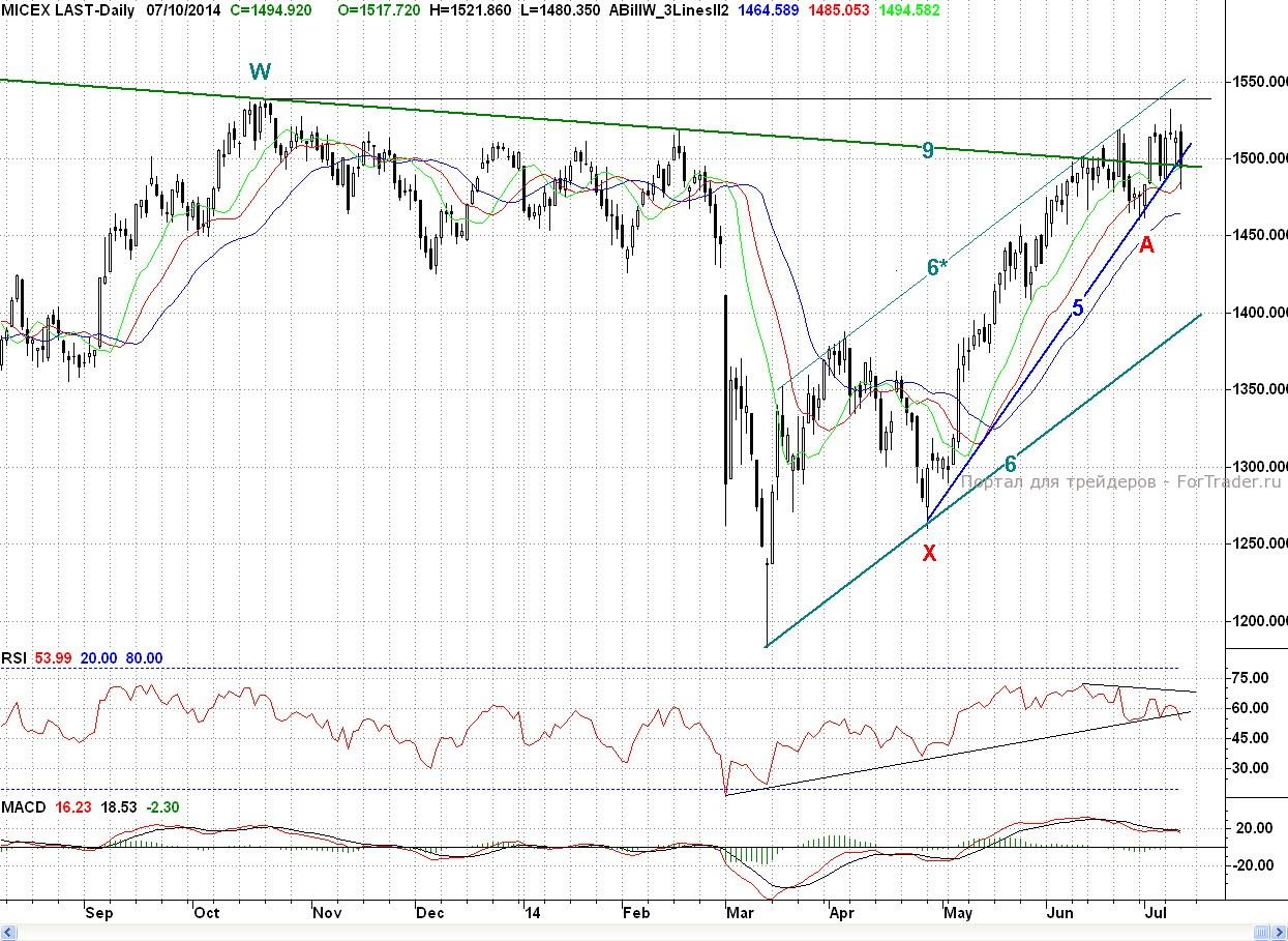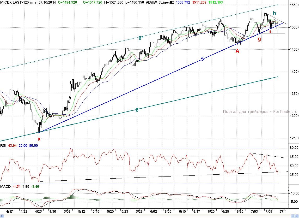 Вчера писалось, что, несмотря, на то, что по техническим индикаторам и на 2- часовом и на дневном графиках присутствуют медвежьи дивергенции, тем не менее одного этого мало, и продавцам для смены растущего тренда для начала необходимо преодолеть ближайший предыдущий минимум S (1 496.98 п.), что и было сделано. Таким образом, медведи сделали существенный шаг к началу полноценной коррекции, С технической точки зрения, хотя индекс ММВБ по Б. Уильямсу по 2- часам и вошел в продажу, но по дням он все еще находится в покупке. Так что для продолжения вчерашней взбучки, продавцам надо еще сильно постараться, чтобы переломить ситуацию в свою пользу. А пока снижение со вторника покупатели могут рассматривать как трехволновый коррекционный откат.