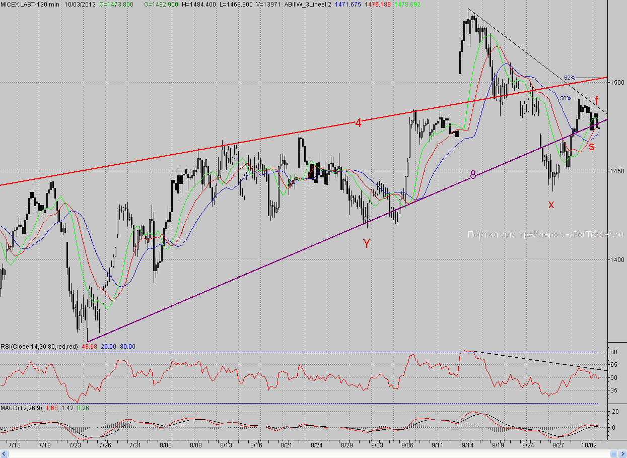 Таким образом, «медведям» частично удалось переломить растущую динамику предыдущих трёх дней и организовать коррекцию. При этом индекс «по 2-часам» по Б.Уильямсу вышел из покупки. И сейчас многое зависит от «быков» — отдадут ли они тренд (8) или станут бороться за него. В роли поддержки для них выступит вчерашний минимум, он же новый 2-часовой фрактал на продажу S (1469,8 п.). При этом покупателям надо уверенно возвращать себе тренд (8) и преодолевать краткосрочный падающий тренд и вчерашний максимум, который стал новым 2-часовым фракталом на покупку f (1484,4 п.). Чуть выше расположен и район максимумов понедельника-вторника, один из которых (1492 п.) может стать новым дневным сигналом. Ключевым рубежом «медвежьей» обороны остаётся долгосрочный растущий тренд (4), здесь же находится и уровень 62%-ной коррекции от падения 17-27 сентября.