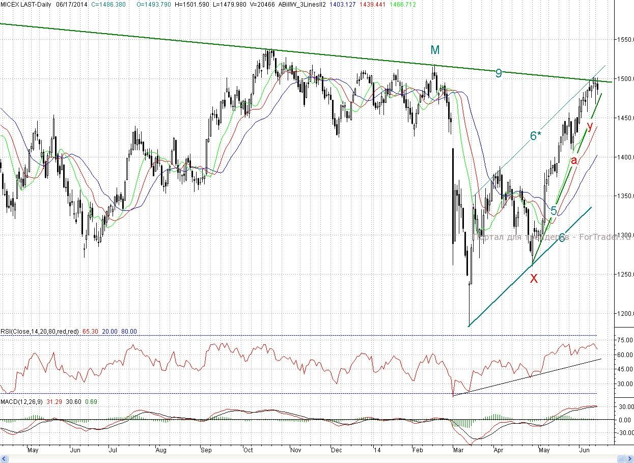Вчера, мы рекомендовали лонг закрыть, и снова открыть короткую позицию со стопом чуть выше верхней границы среднесрочного растущего канала (6-6*). На сегодня рекомендуем удерживать шорт. Стоп выше вчерашнего максимума h (1 501.59 п.) А если он сработает, то переоткрывать короткую позицию от годового максимума М (1 518,12 п.).