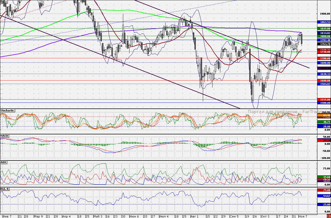 Накануне акции компании уверенно пробили отметку 1780 руб., в связи с чем новой поддержкой станет 1738,24 руб. – 21-дневная скользящая средняя. Сопротивлением является 1780 руб.