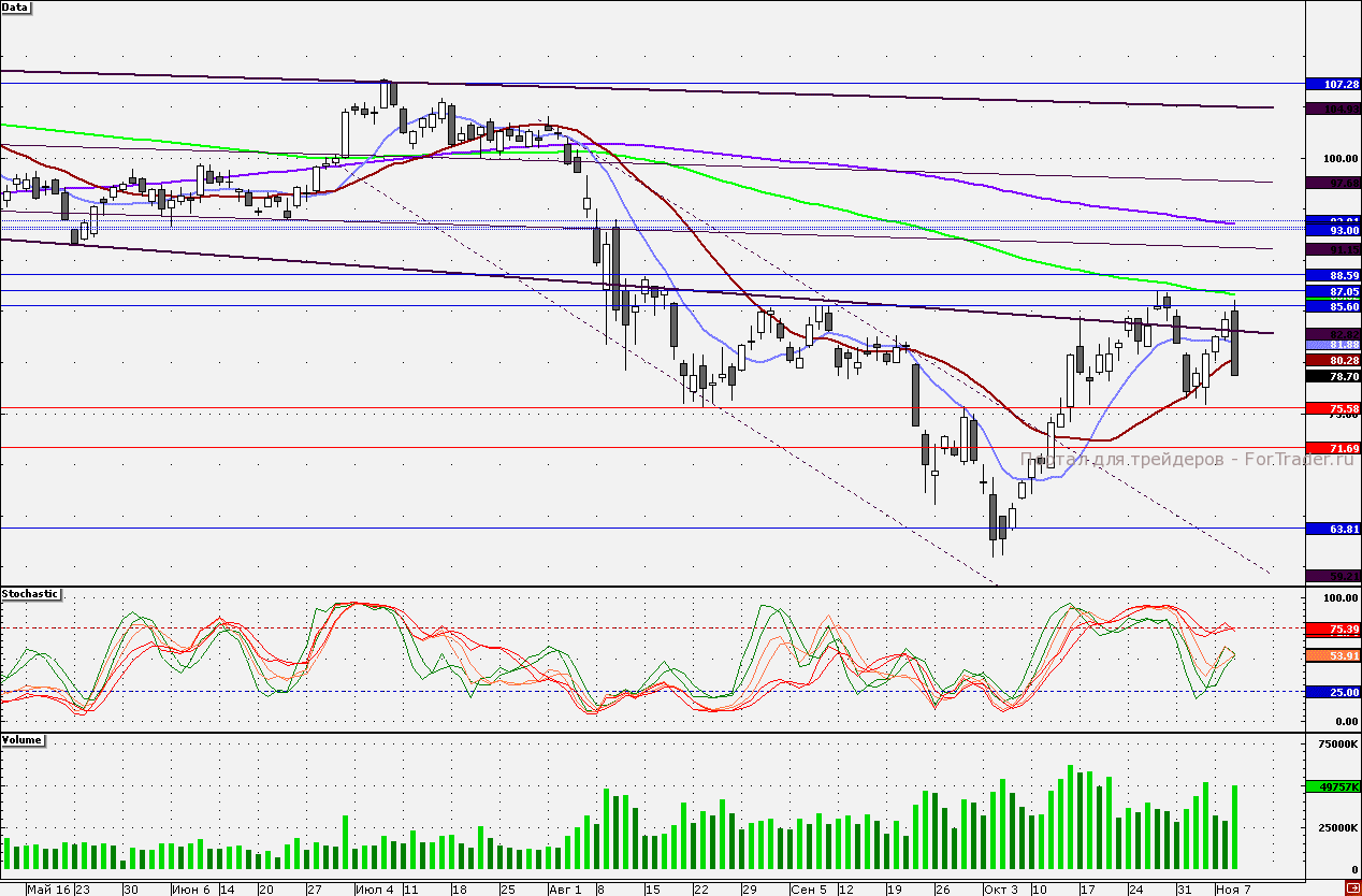Акции банка вчера закрылись ниже 80 руб. Внешний фон располагает к продолжению распродаж, поддержкой является 75,58 руб., но акции вряд ли достигнут данной отметки в начале сессии. Целью для спекулятивного отскока является 10-дневная скользящая средняя 81,88 руб.