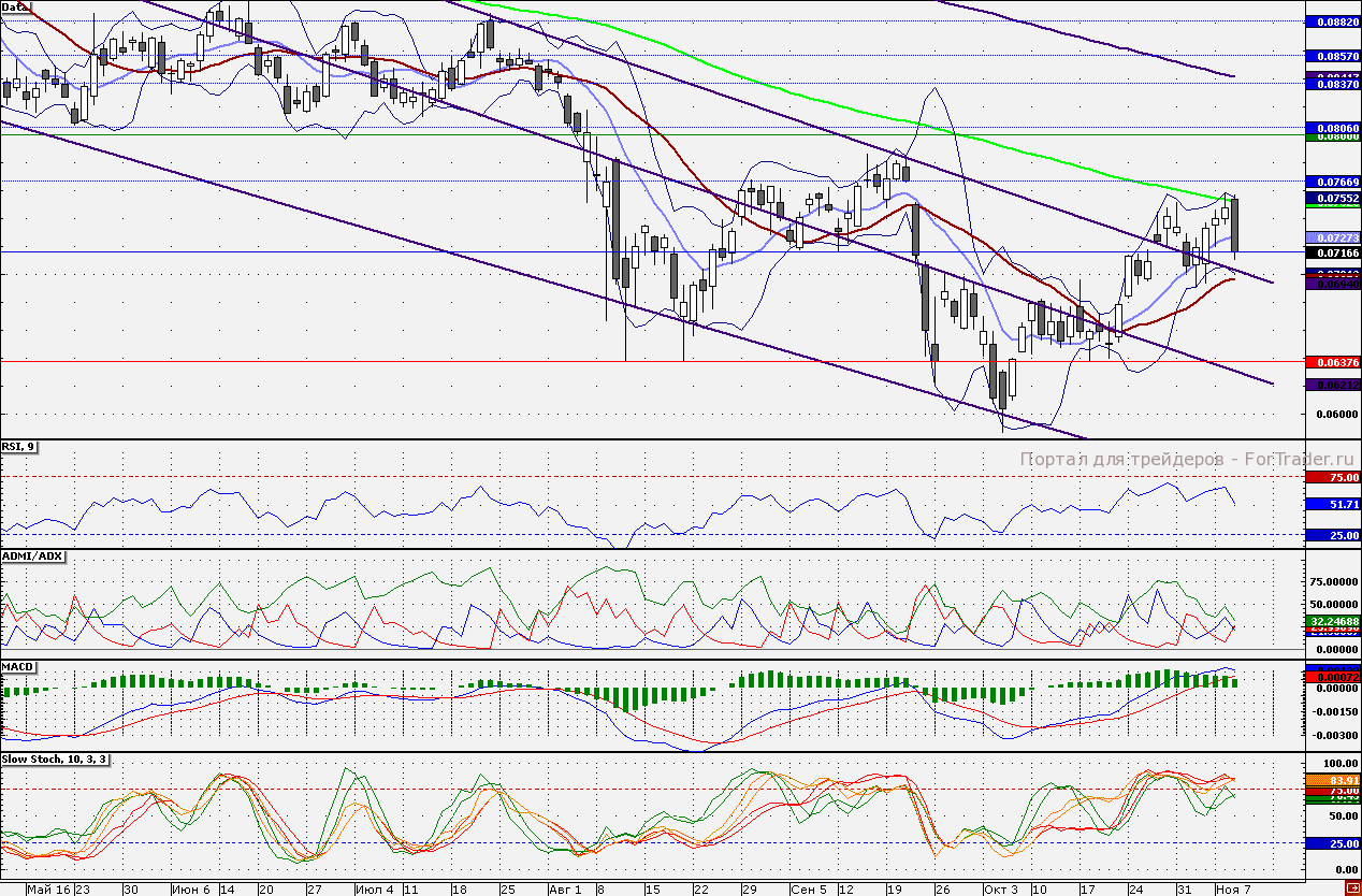 Акции ВТБ закрылись в районе поддержки 7,165 коп. Внешний фон располагает к продолжению распродаж, но следующей поддержки 7,000 коп. акции вряд ли достигнут в начале сессии, поскольку ухудшение внешнего фона незначительно. В случае улучшения внешнего фона акции могут вернуться к 10-дневной скользящей средней 7,273 коп.