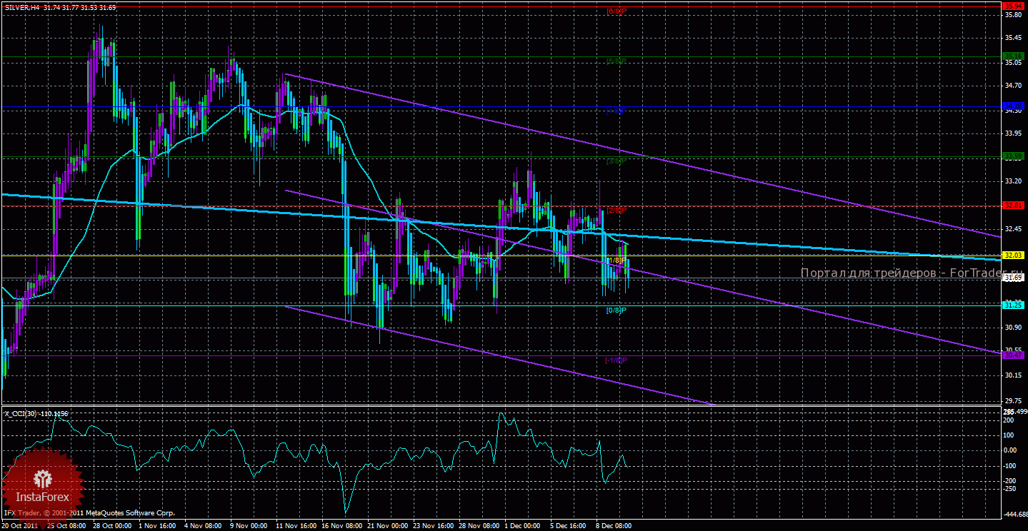 Исходя из анализа серебра 12 декабря видно, что курс серебра, также как и курс золота, находится ниже скользящей средней, что указывает на нисходящий характер движения. Старший канал по-прежнему направлен вниз, что свидетельствует о нисходящем направлении движения глобального тренда. Младший канал направлен вниз, что означает нисходящее движение и в менее долгосрочном плане. Сейчас цена находится ниже мувинга и ниже уровня Мюррея «1/8», отторговать текущее движение можно. Первой целью нисходящего движения является уровень Мюррея «0/8» — 31,25. В случае преодоления первого целевого уровня, нисходящее движение продолжиться с целью «-1/8» — 30,47. Скользящая средняя направлена вниз, а цена в свою очередь находится ниже нее, что сигнализирует о текущем нисходящем движении. Рассматривать торговлю на повышение можно будет не ранее разворота одного из каналов линейной регрессии наверх и закрепления курса выше мувинга. Хайкен Аши окрасил несколько баров в голубой цвет, что сигнализирует о локальном нисходящем движении, что позволяет сейчас открывать шорты. Индикатор CCI находится около уровня -100, что свидетельствует о наличии небольшой перепроданности курса серебра.
