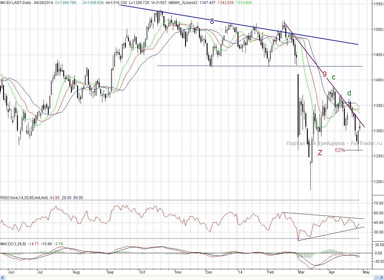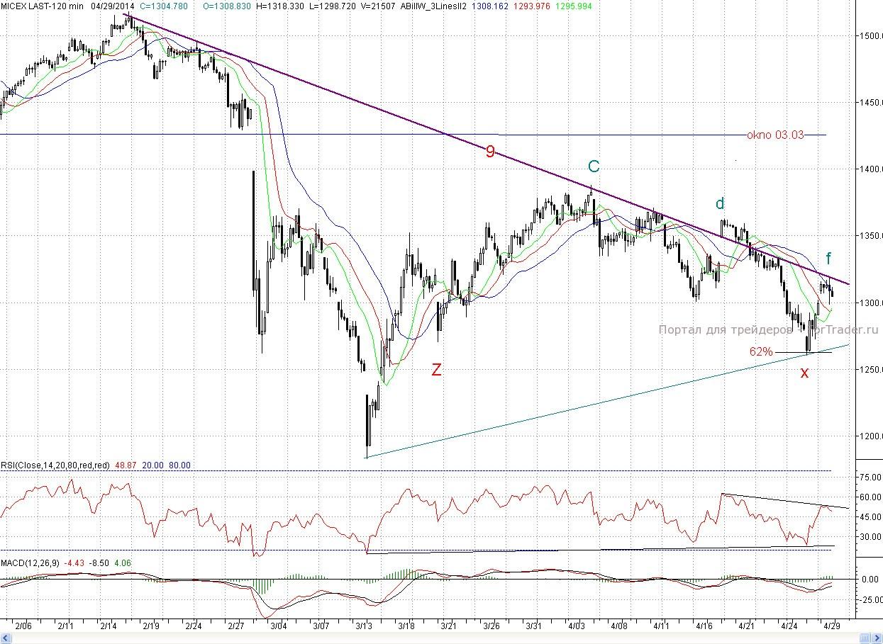 Таким образом, хотя сессия и осталась за покупателями, но сил продолжать контрнаступление у них явно недостаточно, о чем свидетельствуют и снизившиеся объемы торгов. И сейчас главное для быков удержаться на текущих уровнях, а если и отступить, то совсем немного. В этом случае ближайшей поддержкой выступит вчерашний минимум (1 298,72 п.) и уровень 38% коррекции от двухдневного роста, а далее 50% коррекции (~1 289 п.) Ключевым редутом быков остается уровень 62% уже от роста с середины марта и минимум понедельника Х (1 260,43 п.) Роль ближайшего сопротивления сыграет вчерашний вечерний максимум (~1 311 п.), а далее дневной f (1 318,33 п.) и все тот же падающий тренд.