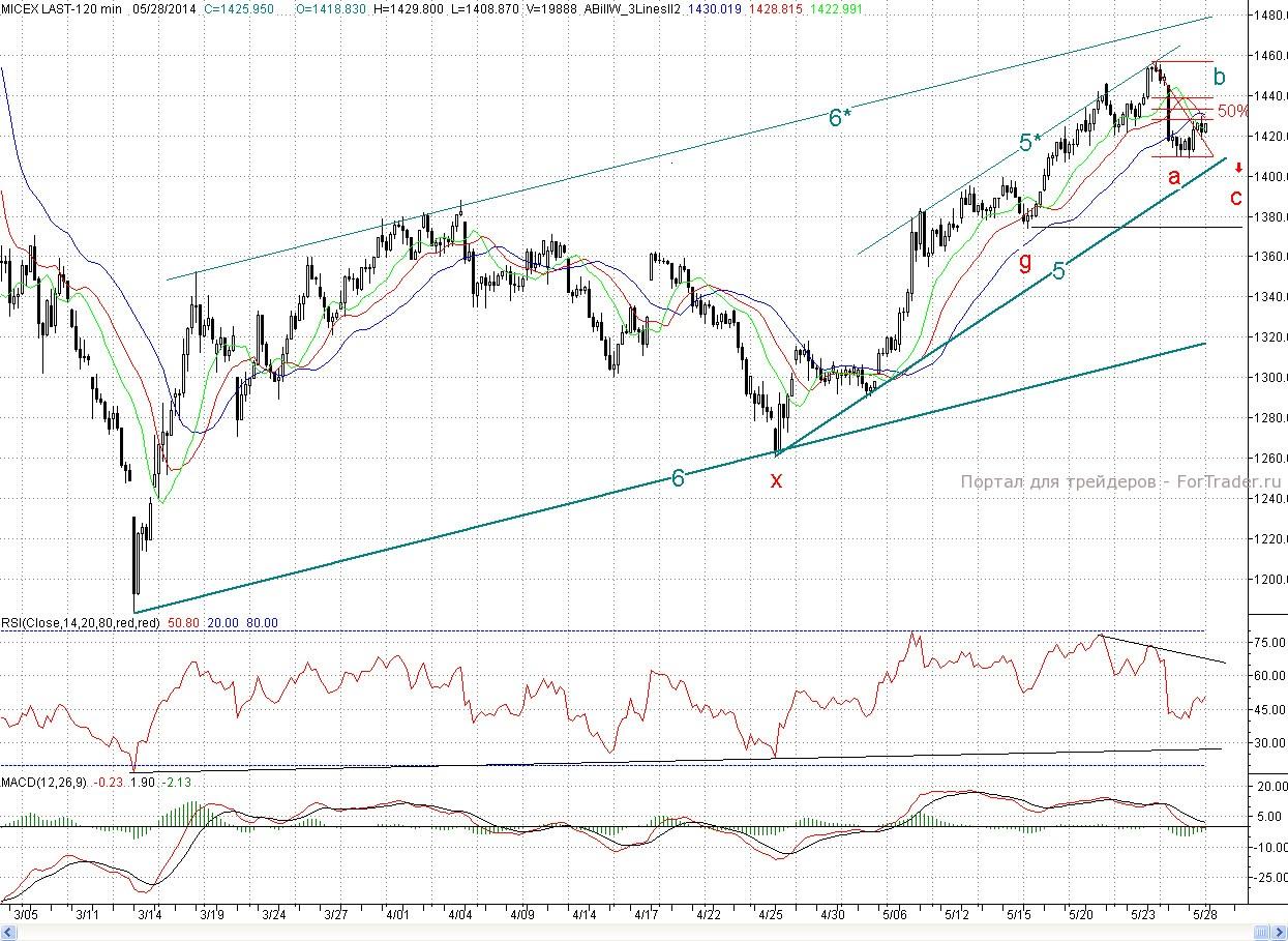 Таким образом, дальнейшего снижения пока не произошло. Но и сильного желания покупать у игроков не наблюдалось. Об этом свидетельствовали и снизившиеся по сравнению с падающим вторником объемы торгов. Тем не менее, отскок в рамках формирования заходной падающей волны (a-b) может продолжаться. И ближайшим сопротивлением выступит уровень 50% коррекции (~1 433 п.) от снижения со второй половины понедельника, а далее уровень 62% коррекции (~1 439 п.). Более сильным медвежьим редутом будет незакрытое окно вторника (1 445 – 1 449 п.) Роль ближайшей поддержки сыграет вчерашний вечерний минимум (1 418,52 п.), а далее дневной a (1 408,87 п.) В этот же район подтянулся и среднесрочный растущий тренд (5)