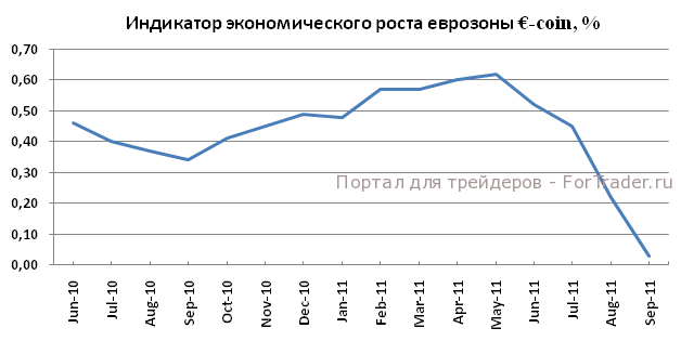 Это подтверждает и тот факт, что индикатор экономического роста еврозоны евро-коин (€-coin), который рассчитывается итальянским исследовательским институтом CEPR, и отражает квартальные темпы роста ВВП, в третьем квартале составил 0,03% против 0,52% во втором квартале. Не исключено, что уже в четвертом квартале квартальный рост ВВП в еврозоне будет отрицательным.