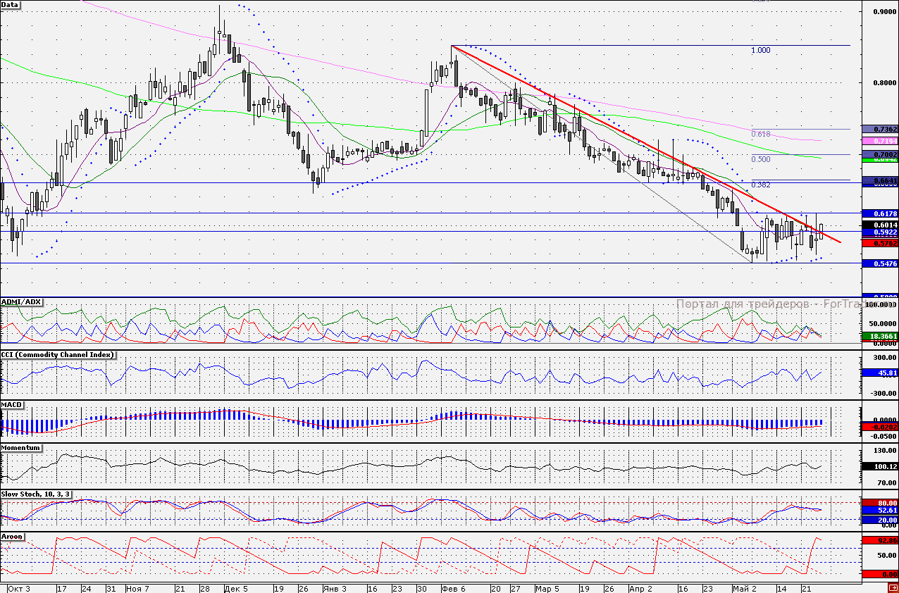 Сегодня акции ОГК-1 в очередной раз предпринимают попытки пробития линии нисходящего тренда (59,22 коп.), в котором бумаги двигаются с середины февраля текущего года. На мой взгляд, привлекательность «лонгов» возрастет только после закрепления акций над линией нисходящего тренда. Вероятность преодоления довольно мощного уровня сопротивления достаточно велика. Многие индикаторы направлены в сторону развития «бычьего» сценария. Индикатор ADMI/ADX, показывает, что на смену «медведям» приходят «быки» (линия «медведей» сверху вниз пересекается с линией «быков»). Индикатор Aroon (14) свидетельствует о возможном развитии восходящей динамики (линия Aroon Down снизу вверх пересекается с линией Aroon Up). Накануне график индикатора Parabolic SAR сверху вниз пересекся с графиком акций, что также может свидетельствовать о развитии восходящей динамики. В случае пробоя линии нисходящего тренда целью для продолжения восходящей динамики по акциям выступит отметка 66,40 коп., где проходит уровень 38,2%-коррекции по Фибоначчи, проведенный между максимумом февраля и минимумом мая текущего года. Однако для достижения данной цели акциям необходимо преодолеть уровень сопротивления 61,78 коп., где находится верхняя граница диапазона (54,76-61,78 коп.) в котором бумаги двигаются с 7 мая текущего года, но показания индикаторов свидетельствуют о высокой вероятности преодоления данного уровня сопротивления.