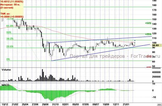 Бумаги «ТМК», закрепившись выше локального нисходящего тренда от 18 февраля 2013 года – 94 рубля, смотрятся неплохо на дневном графике. Они вполне могут дойти до сопротивления 106,2 рубля (уровень Фибоначчи 38,2% к падению бумаг в 2011 году). Это сулит около 11% прибыли тем, кто успеет купить бумаги примерно по вчерашним ценам закрытия. Но, не спешите! Недельный график простую игру по этим бумагам не предвещает. Восходящий тренд, зародившийся здесь в начале 2012 года, неустойчив, и давно не обновлял «хай». Именно пробой отметки 106,2 может вернуть веру долгосрочных инвесторов в силу растущего движения. Справедливости ради отмечу, что и на недельном графике есть позитивные сигналы — оживший объем торгов и MACD (13,26,9) пытается обосноваться в зоне «быков». В целом сравнивая дневной и недельный срез «ТМК» можно сделать вывод: если ваш портфель загружен и/или некогда следить за «ТМК» в ближайшие сессии, то лучше с ними подождать. В ином случае, это хорошая идея для тех, кто знает особенности спекуляций на подобных бумагах, умеет правильно расставлять приоритеты и временные фильтры.