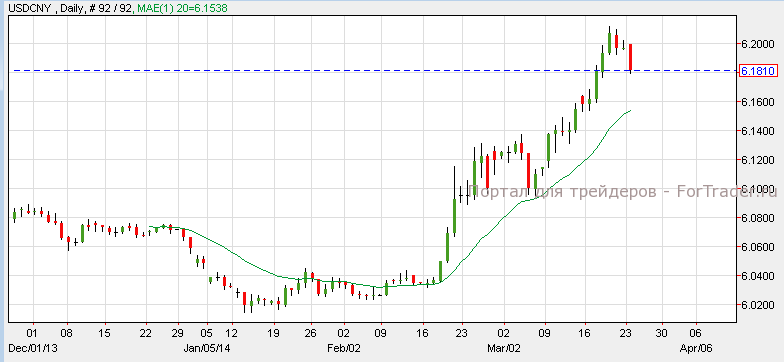 Китайский юань укрепился против доллара США, в результате роста с отметки 6.2100 до отметки 6.1810, так как Центральный Банк повысил ориентирную ставку валюты. Промежуточный индекс опроса менеджеров по закупкам в производственном секторе от HSBC вышел хуже прогнозов и также повлиял на снижение пары доллар/юань. Согласно техническому анализу, пара может упасть к отметке 6.1600 если удержится на текущем уровне сопротивления 6.2100. Если Центральный Банк вновь укрепит юань, он достигнет пункта 6.1000, который может стать для пары сильным уровнем сопротивления.