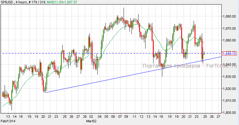 Американские индексы завершили торговый день падением после выхода неутешительных новостей в Китае и Европе. Напряженность в отношениях России и Украины продолжает негативно влиять на рынок. NASDAQ упал на 0.98%, S&P 500 упал на 0.49%, а Dow Jones потерял от стоимости 0.16%. Согласно анализу 4-часового графика, S&P 500 торгуется на сильном уровне поддержки 1,840 и вчера индекс не смог пробить его. Если сегодня индекс задержится на уровне поддержки, возможен его рост к отметке 1,860, а прорыв уровня 1,860 приведет индекс к отметке 1,875. Если индекс опустится ниже уровня поддержки 1,840, это укажет на восходящий тренд и возможно дальнейшее снижение с целью на отметке 1,805.
