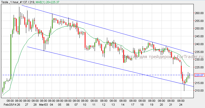 Американская компания Tesla разрабатывает, производит и продает автомобили. В январе акции компании вырасли на 40%, однако вчера акции снизились на 6% и закрылись на отметке 220. Согласно анализу 1-часового графика, акции торгуются в нисходящем канале с уровнем поддержки 210. Прорыв этого уровня поддержки может привести акции к отметке 190, тем не менее, прорыв этого канала на отметке 235 может вызвать дальнейший рост с целью на отметке 260.