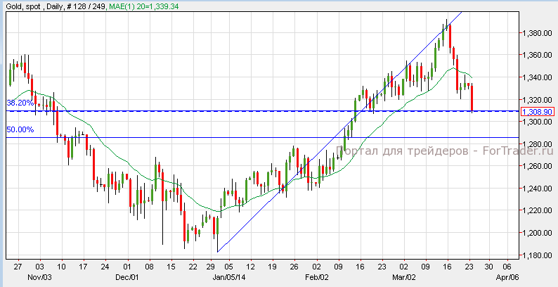 Золото значительно подешевело. Согласно анализу дневного графика, нисходящий импульс золота достиг уровня коррекции Фибоначчи 38.20%. Драгоценный металл торгуется на сильном уровне поддержки $1,305, и его прорыв может привести к резкому снижению до уровня $1,290. Если золото удержится на уровне поддержки, возможен рост к отметке $1,340 или даже к отметке $1,360.