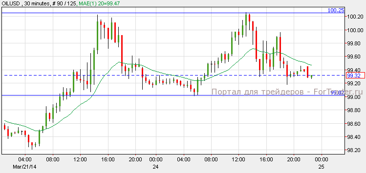 Нефть торгуется между ценой $99 и $100.25 за баррель. В прошлую пятницу нефть достигла уровня сопротивления, а вчера почти достигла уровня поддержки – эти скачки указывают на то, что из-за нестабильной ситуации в России и Украине, экспертам трудно определить направление нефти. На черное золото так же влияет ситуация на Уолл-стрит, так как любое падение или рост акций отражается на курсе нефти. В среду ожидается выход Запасов сырой нефти.