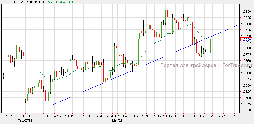 Евро резко вырос против доллара США после задержки на уровне поддержки 1.3750. Этот курс выглядит как автоматическая закупка на фоне спекуляций о том, что Россия не станет совершать военных действий против Украины. Если бы вчера пара удержалась на уровне поддержки 1.3850, тренд изменится бы на восходящий. На данный момент пара евро/доллар торгуется на уровне 1.3835. Согласно техническому анализу 8-часового графика, цена находится ниже линии тренда. Мы ожидаем от пары попытки пробить уровень 1.3850. Однако, задержка на этом уровне сопротивления может привести пару к отметке 1.3550. Согласно прогнозам, Индекс делового климата в Германии от Ifo составит 110.9 против 111.3 пункта ранее.