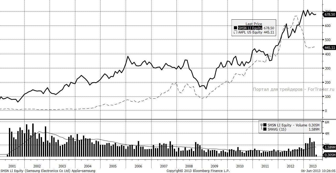 Противостояние компании Apple и Samsung продолжается. С 2008 по 2012 года компании двигались вровень, однако сейчас их разрыв увеличивается. У Самсунга линейка продукции шире, сеть продаж также шире, что безусловно является большим преимуществом. Это мнение не разделяет Алишер Усманов, который инвестирует в акции «яблочной компании». Мы разделяем его мнение, по технике, акции Apple сейчас выглядят очень привлекательными.