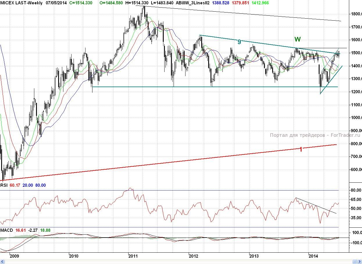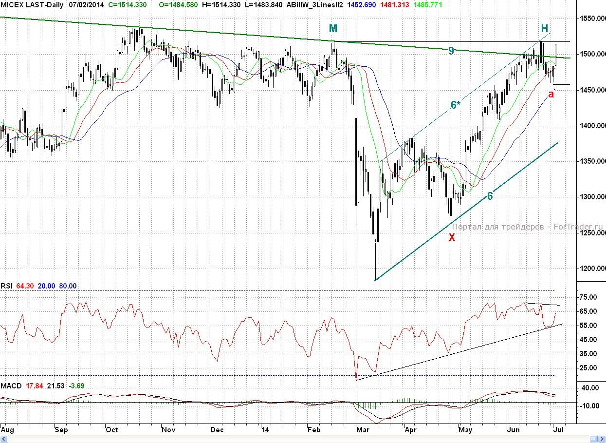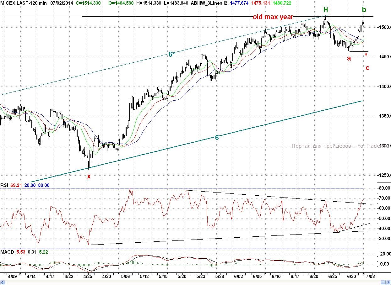 Исследуя 2-часовой график индекса ММВБ, видим, что открывшись с небольшим гэпом вверх, котировки продолжили рост. Первую ближайшую поддержку — уровень 50% коррекции (~1 490 п.) от четырехдневного снижения быки прошли очень легко, и к полудню цены достигли более серьезного медвежьего редута в лице уровня 62% (~1 497 п.) и верхней грани (9) двухлетнего треугольника. Удержание этого района позволяло медведям рассчитывать на то, что данный рост является лишь отскоком после четырехдневного снижения, в рамках формирования заходной падающей волны (а-b). Однако, быки были не согласны с такой постановкой вопроса, и после обеда уверенно преодолели вышеназванный барьер. А в этом случае, как писалось вчера, дорога на годовой максимум H (1 519,04 п.) стала открыта. И лишь только нехватка времени не позволила котировкам достичь желанной цели. Тем не менее, день завершился в отличном плюсе (2,12%).