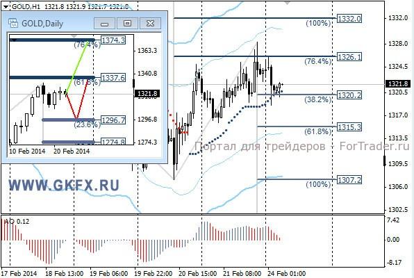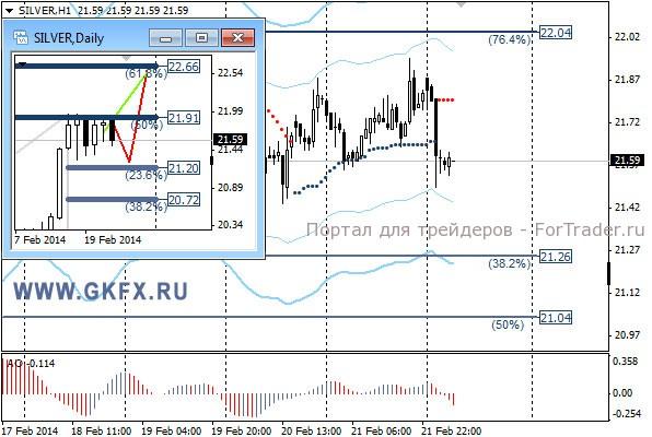 Цены на серебро, как и ожидалось, корректируются в диапазоне 21,40-21,95. На данном этапе коррекция может иметь продолжение в том же диапазоне. На прошлой неделе, на дневном графике не отработался не один из вариантов движения цены. Традиционно делаю два варианта движения цены на неделю, основной красный и альтернативный зеленый. Значимые уровни на сегодня отмечены на часовом графике. Индикатор АО находится в отрицательной зоне и снижается, указывая на желание цены двигаться вниз в данное время. Индикатор тренда указывает на снижение. Вне рынка.