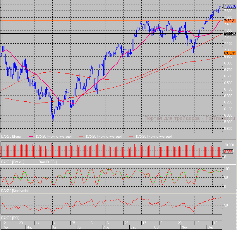 На фоне сильной статистики, уверенную динамику демонстрирует немецкий индекс DAX – индикатор просел утром до 7660 пунктов, но после данных стал ползти вверх и достиг в итоге отметки 7680 пунктов, однако пока не смог его удержать.