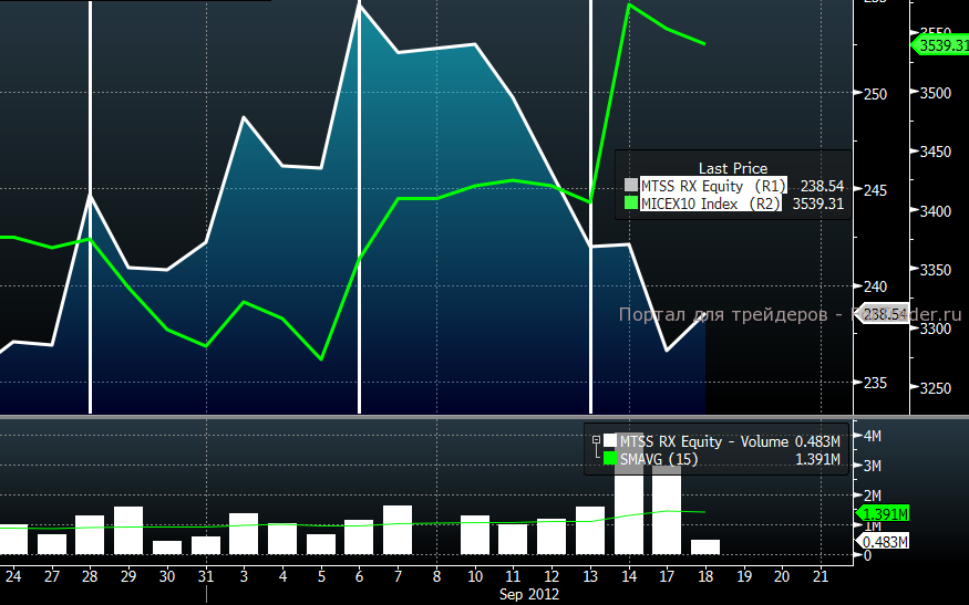 Это наглядно характеризует график. С 28.08. по 06.09. очевидно падение индекса, и укрепление МТС, во время туманности перспектив в еврозоне и неясности с принятием решения о запуске «печатного станка» 31.08 на выступлении Бена Бернанке в Джексон Хоуле. После 06.09., на фоне комментариев главы ЕЦБ Марио Драги о неограниченном кредитовании европейским регулятором, что вызвало оптимизм рынка, пошла совершенно противоположная динамика. Ну и наконец, 13.09. день запуска «печатного станка» в США, где мы видим падение МТС.