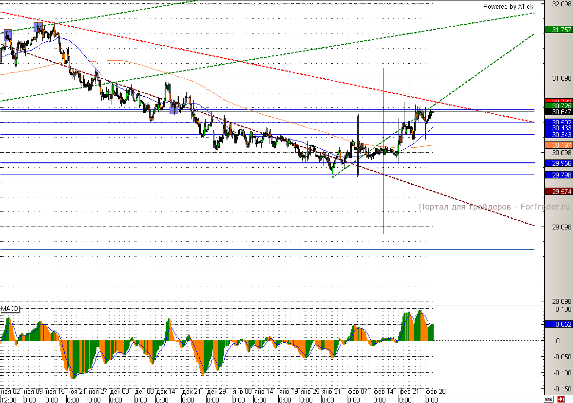При этом данная пара вновь вплотную подобралась к своему ключевому сопротивлению на отметке 30,7. Пробить данный уровень будет очень сложно и, вероятно, понадобятся более сильные драйверы. Поэтому торопиться продавать рубли пока не стоит. Сегодня давление на российскую валюту оказывает незначительное снижение нефтяных котировок, а также всеобщий уход из риска на фоне, того, что накануне 2 альтернативных плана  по смягчению секвестра были отвергнуты и сегодня все ждут наступления данного события. Впрочем, сильно расстраиваться по поводу наступления секвестра бюджета в США не стоит, большая его часть уже заложена в прогнозы по американской экономике на текущий год, а частичное его смягчение, скорее всего, произойдет уже в самое ближайшее время.
