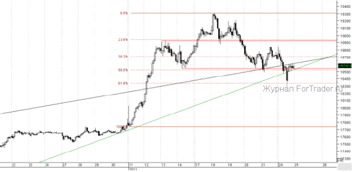Вчера сразу после позитивного открытия торгов на срочном рынке началось снижение котировок. Продажи акций и выход из бумаг в деньги конкретно на отечественных биржевых площадках позволили фьючерсу на индекс РТС протестировать силу линий поддержки на графике в районе 185 000. На этом, скорее всего, вчерашние движение и закончились бы, однако террористический акт в аэропорту Домодедово вызвал дополнительный импульс вниз, который был выкуплен на вечерней торговой сессии. Фьючерс на индекс РТС по итогам торгов изменился на -0,52%. Индексы в Америке закрылись в уверенном плюсе: Dow Jones повысился на 0,92%, Nasdaq вырос на 1,04% и S&P 500 показал плюс 0,58%. В Европе изменение FTSE 100 составило +0,81%, DAX изменился на +0,08%.
