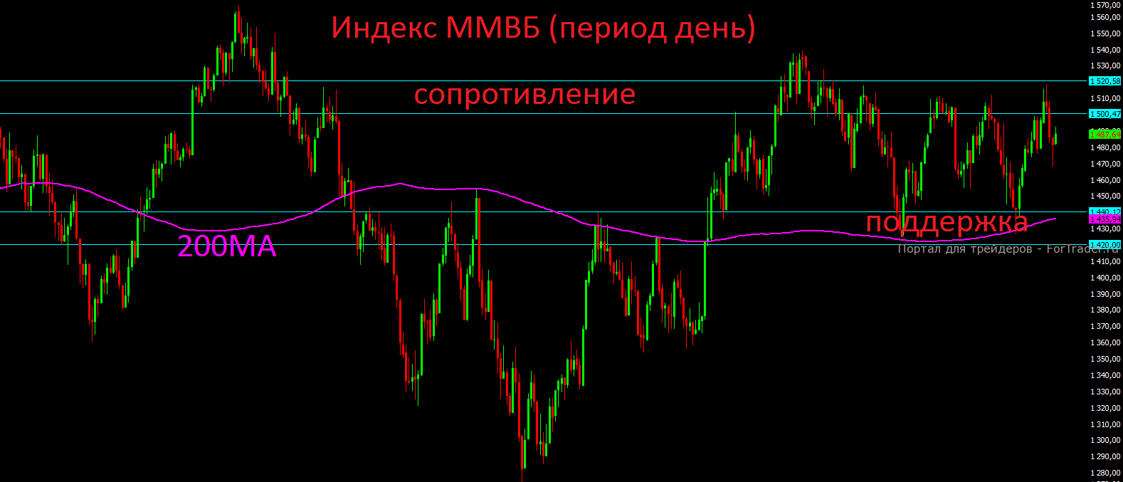 С технической точки зрения, российский индекс ММВБ находится ровно посередине бокового диапазона, который продолжается уже более 5 месяцев. На предстоящую неделю мы делаем ставку на дальнейшее снижение вплоть до верхней границы диапазона поддержки 1420-1440 пунктов.