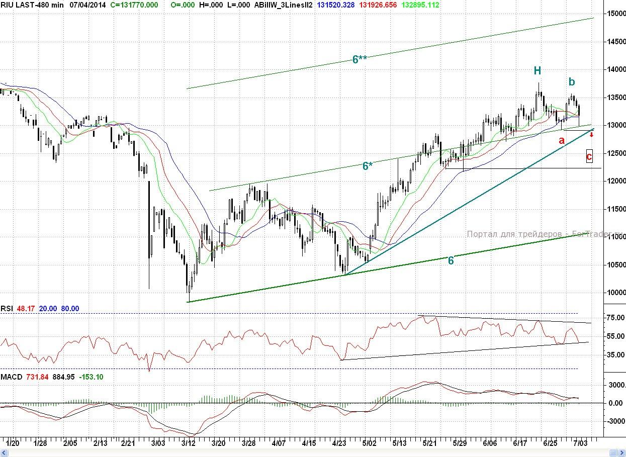 Картина по фьючерсу на индекс РТС позволяет надеяться медведям, что рост вторника — среды сформировал заходную падающую волну (a-b). А снижение с четверга стало началом продолжения понижательной тенденции. Но для реализации этого сценария мишкам необходимо уверенно проходить минимум прошлой недели a (129 170 п.). В этом случае падение c большой вероятностью продолжится до района минимальных значений конца мая – начала июня (~122 000п.)
