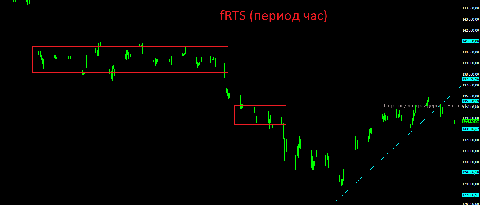 Фьючерс на индекс РТС так и не смог почти за целую неделю закрепиться выше отметки 135500 пунктов и на фоне падения курса рубля показал вчера существенное снижение. Важный уровень поддержки на отметке 133000 на закрытии дня пока устоял, поэтому говорить об окончательном развороте вниз пока рано, но всё идёт именно к этому. Закрытие дух дней подряд или ниже отметки 133000 пунктов или выше 135500, окончательно определит вектор движения на ближайшую неделю.