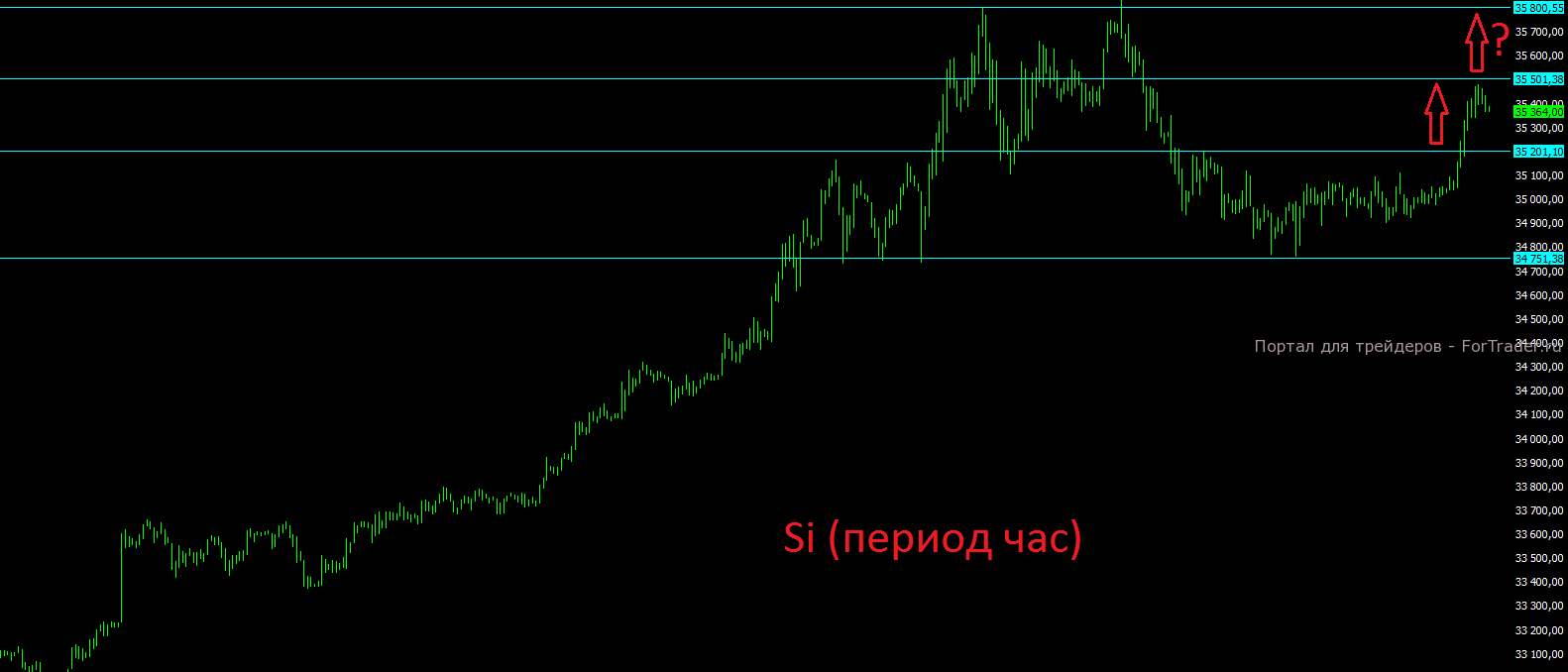 На локальной картине по фьючерсу на валютную пару доллар рубль прекрасно видно, как цена прорвала вверх диапазон консолидации и пока есть все шансы вновь увидеть отметку 35800 по данному инструменту, если ЦБ не предпримет никаких действий.