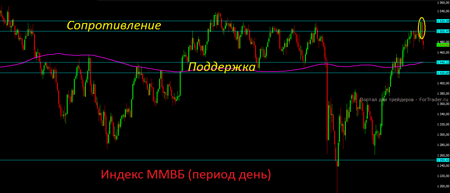 После сильных распродаж в среду, в четверг негативные настроения продолжились и на дневном графике индекса ММВБ мы получили подтверждение разворотной свечной модели. Первые цели коррекции и ближайшая поддержка находится в диапазоне 1420-1440 пунктов.